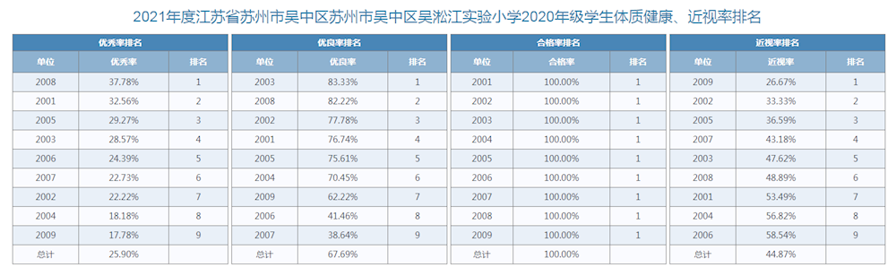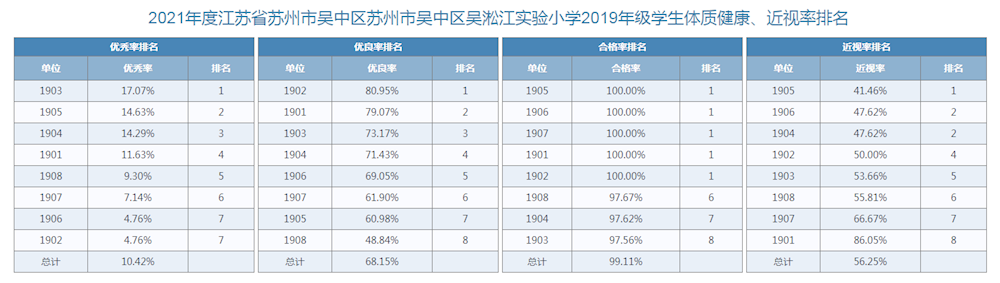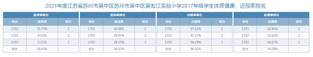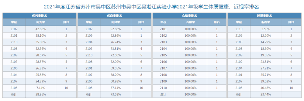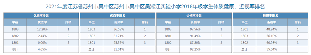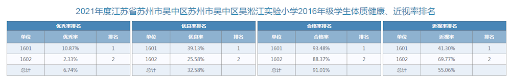 2021年度吴中区吴淞江实验小学各年级各班学生体质健康、近视率排名