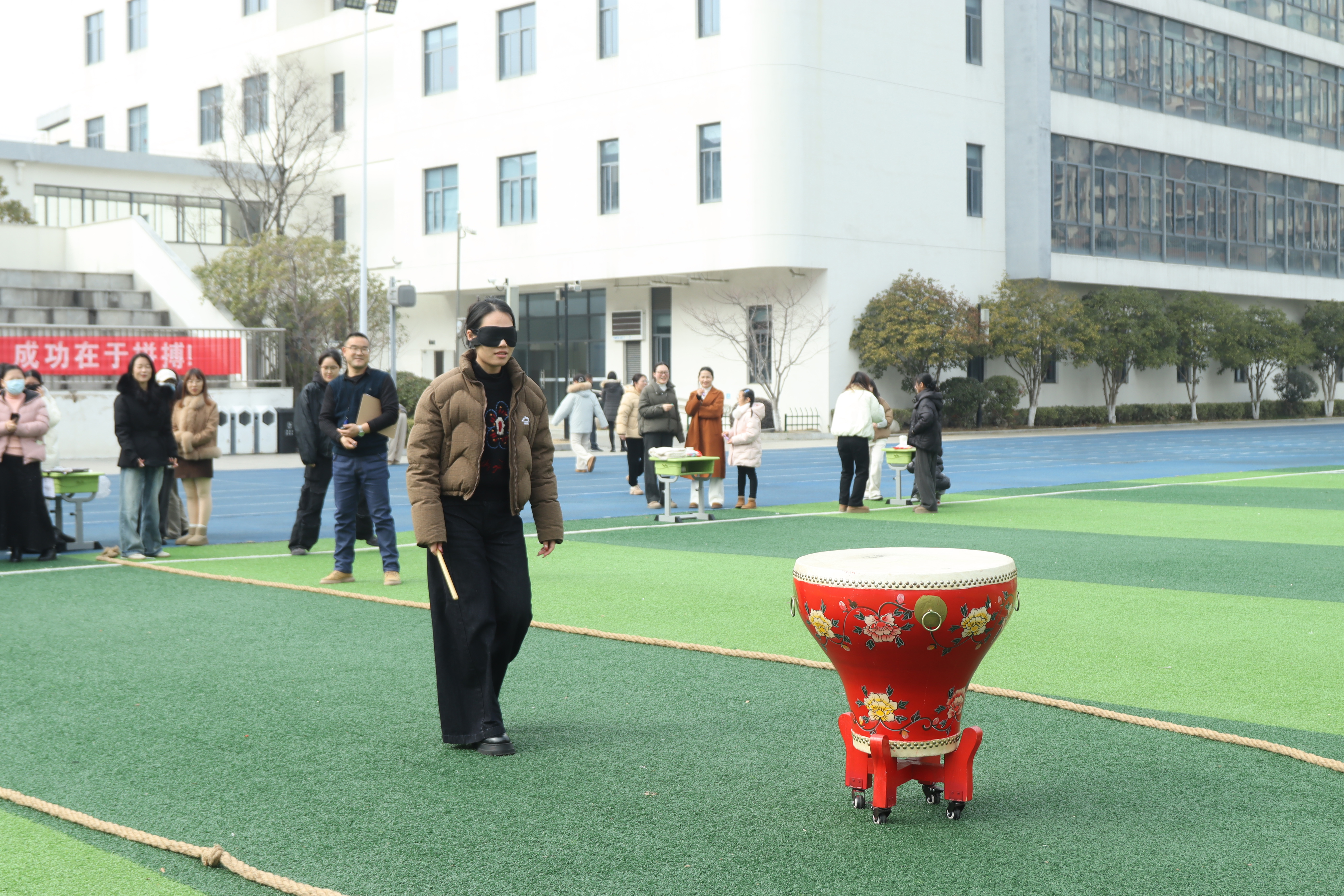 蒙上眼罩的瞬间,让平日从容授课的老师们多了几分俏皮与忐忑。有人精准锁定方向,大步流星;有人在摸索中略显“迷糊”,左右试探。老师们享受着这场“盲盒式”挑战的乐趣。