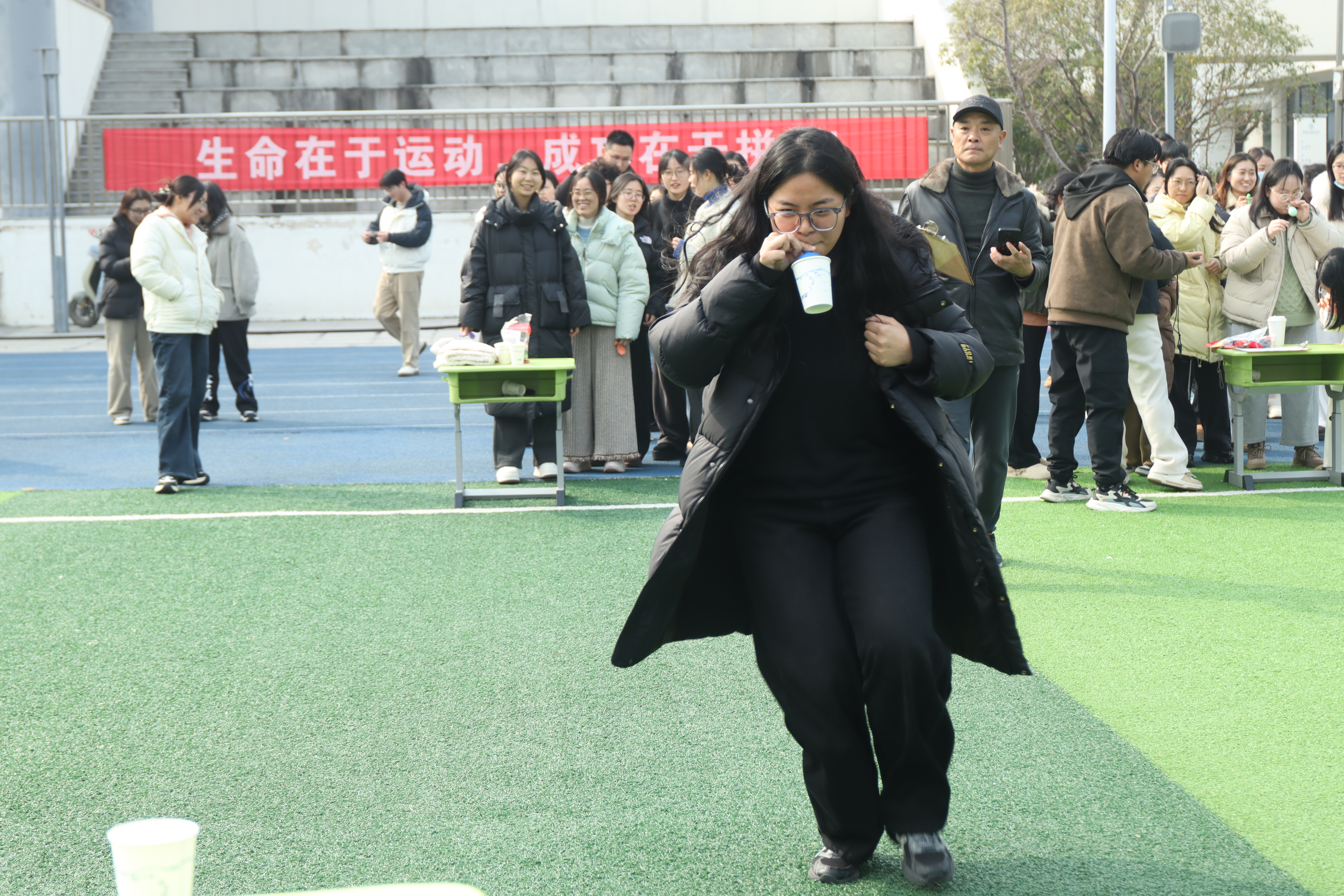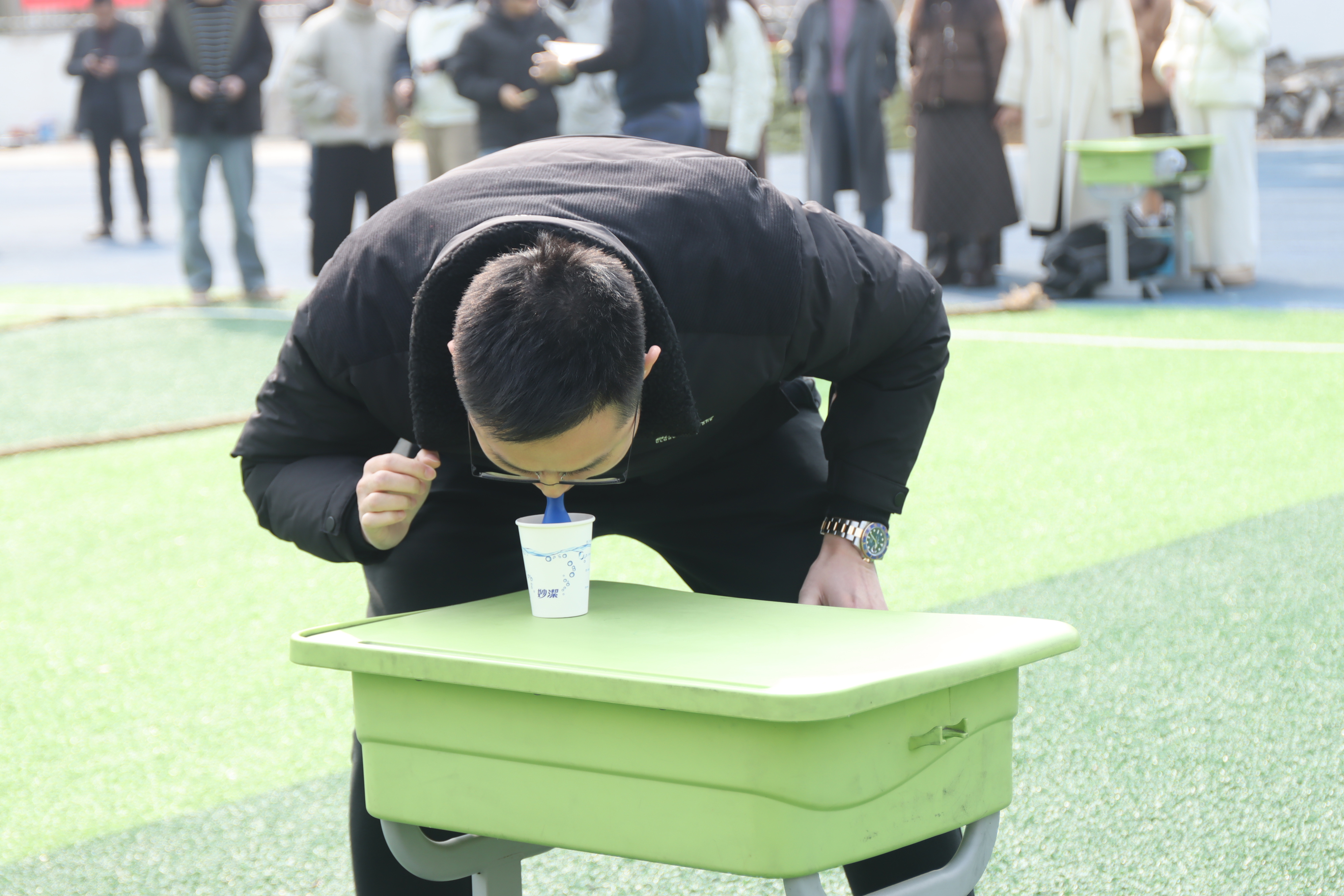叼着气球、托着纸杯,老师们化身“精准传递官”。吹气时小心翼翼控制力度,前行时屏气凝神保持平衡。当成功将纸杯放置在终点桌面时,老师们脸上都洋溢着如释重负的喜悦,这份“唇齿间的胜利”格外珍贵。