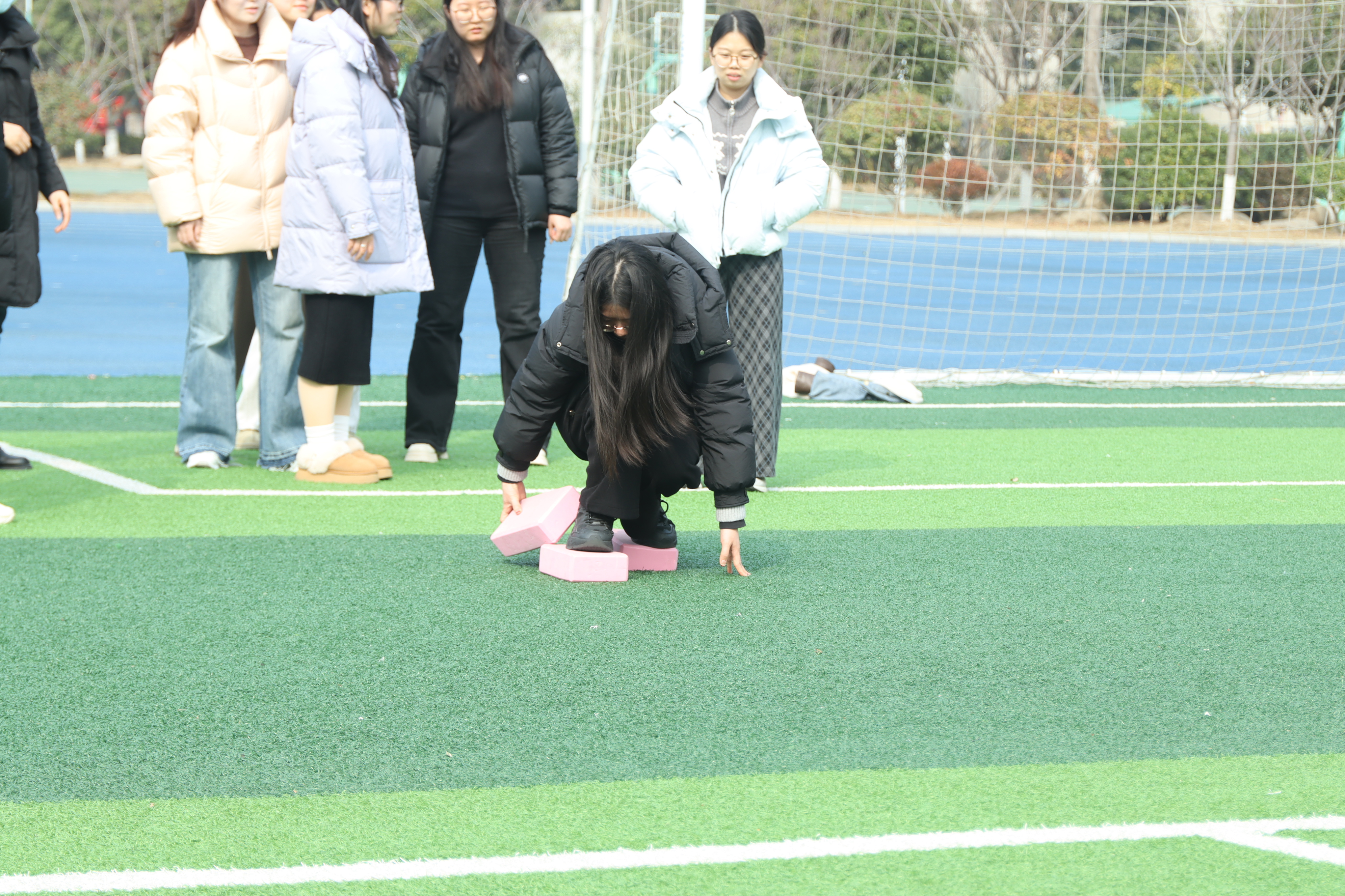 三块泡沫砖,成为老师们的“法宝”。比赛中有的老师动作敏捷,快速冲向终点;有的老师稳扎稳打,尽显从容,即便偶尔“落水”,也立刻重新出发,脸上始终带着不服输的笑容。